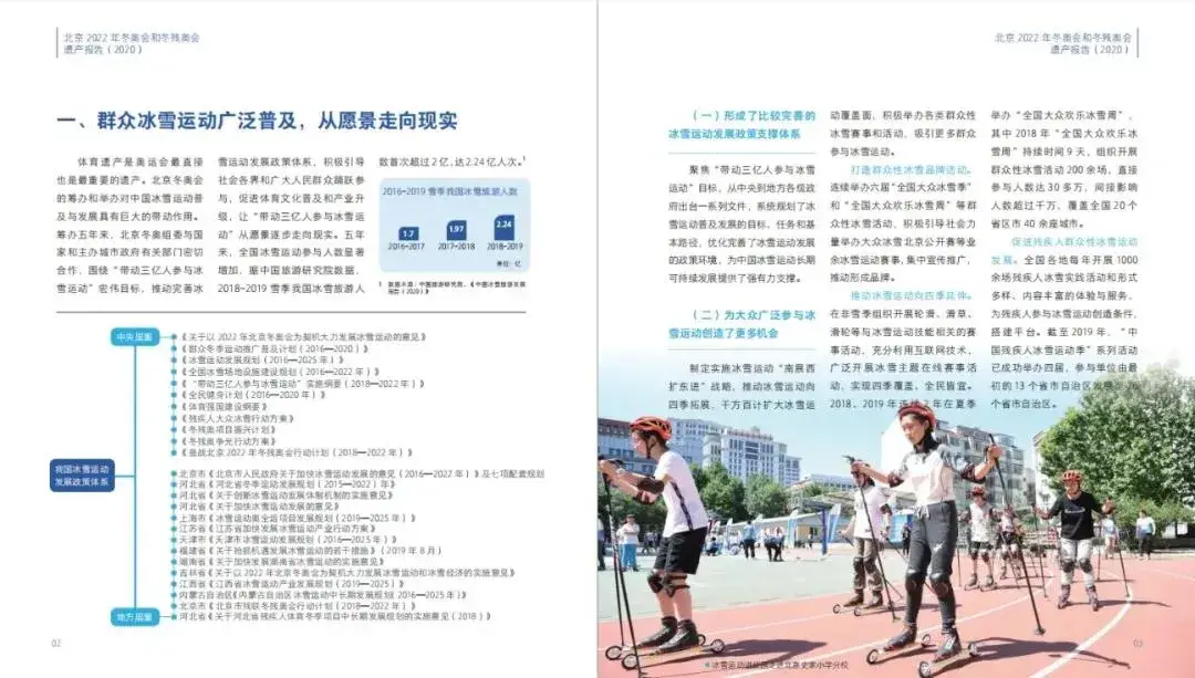 为系统总结北京冬奥会遗产成果,受北京冬奥组委的委托,北京体育大学会同北京冬奥组委总体策划部共同编制完成了《北京2022年冬奥会和冬残奥会遗产报告(2020)》中文版和国际版。报告以图、文和专栏的形式总结提炼了北京冬奥会自2015年申办成功以来筹办工作所形成的遗产成果,重点呈现了促进中国冰雪运动普及发展,超前谋划场馆赛后利用,持续提升京张地区生态环境,促进京津冀地区协调发展,主办城市转型发展,引领社会文明进步。